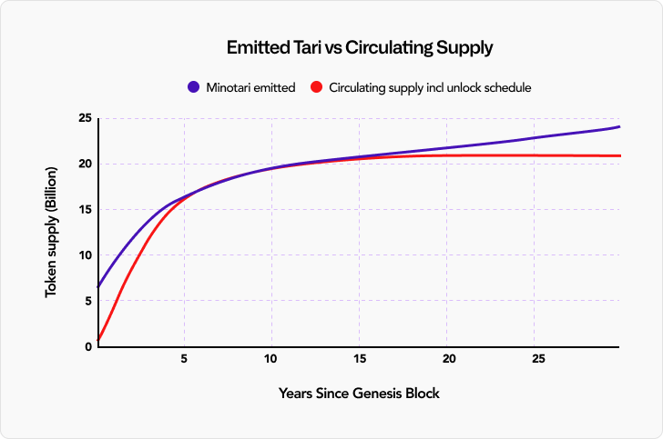 Please note that just because these tokens are unlocked does not necessarily mean they will be circulating. For example, tokens allocated for Protocol Infrastructure and Grants will be unlocked but held back from circulating supply until they can be deployed to improve the usefulness of the Tari network.